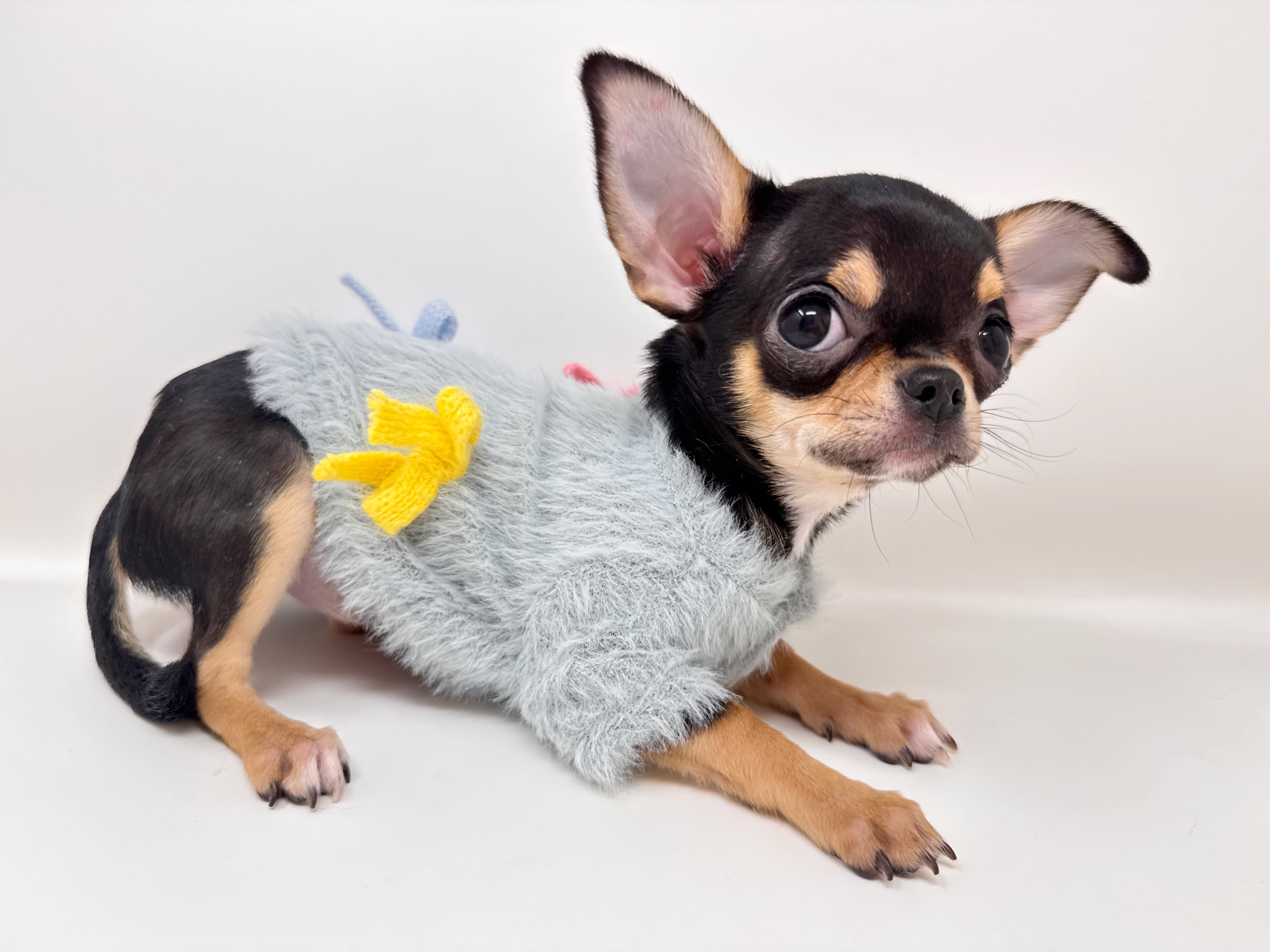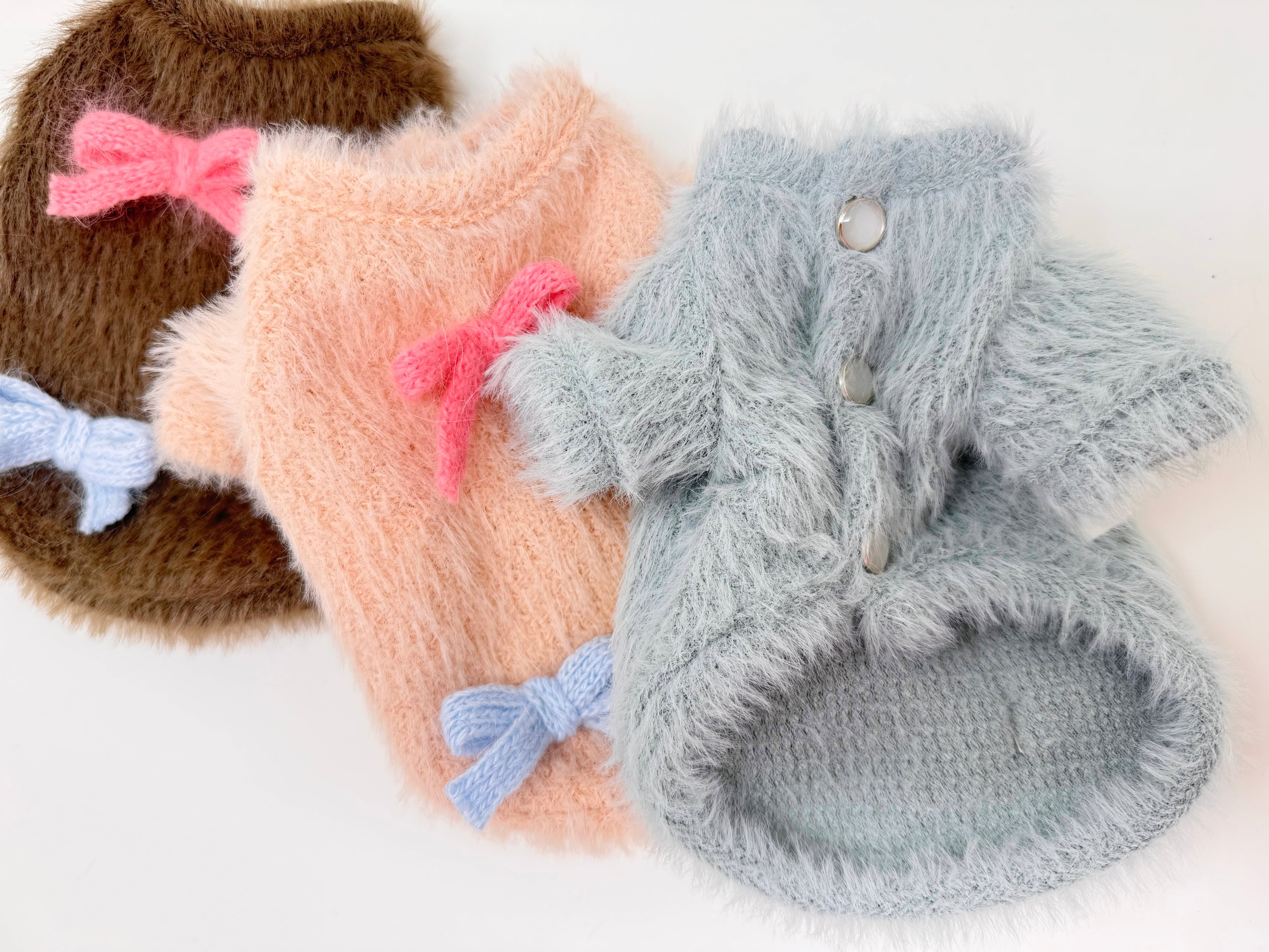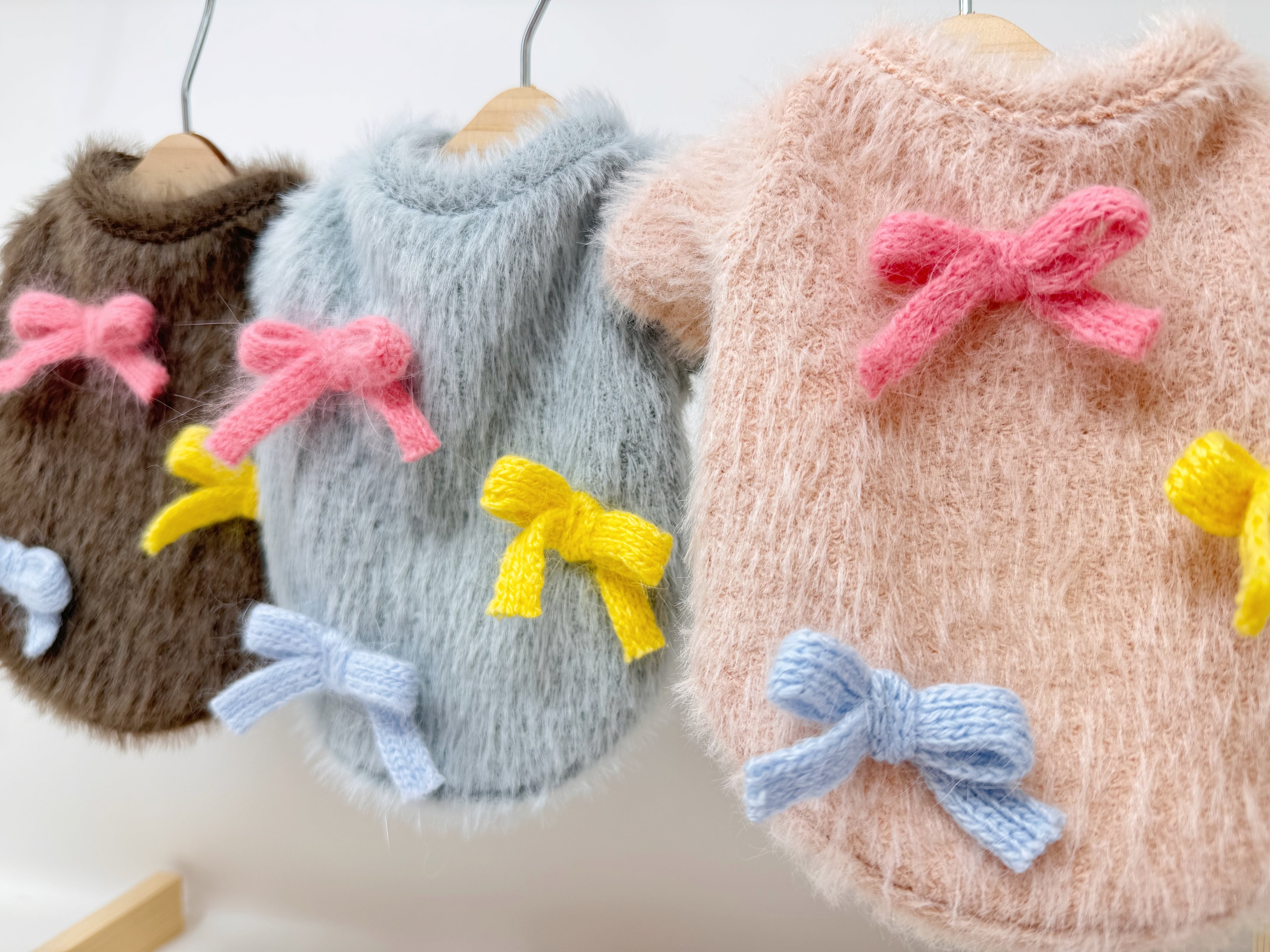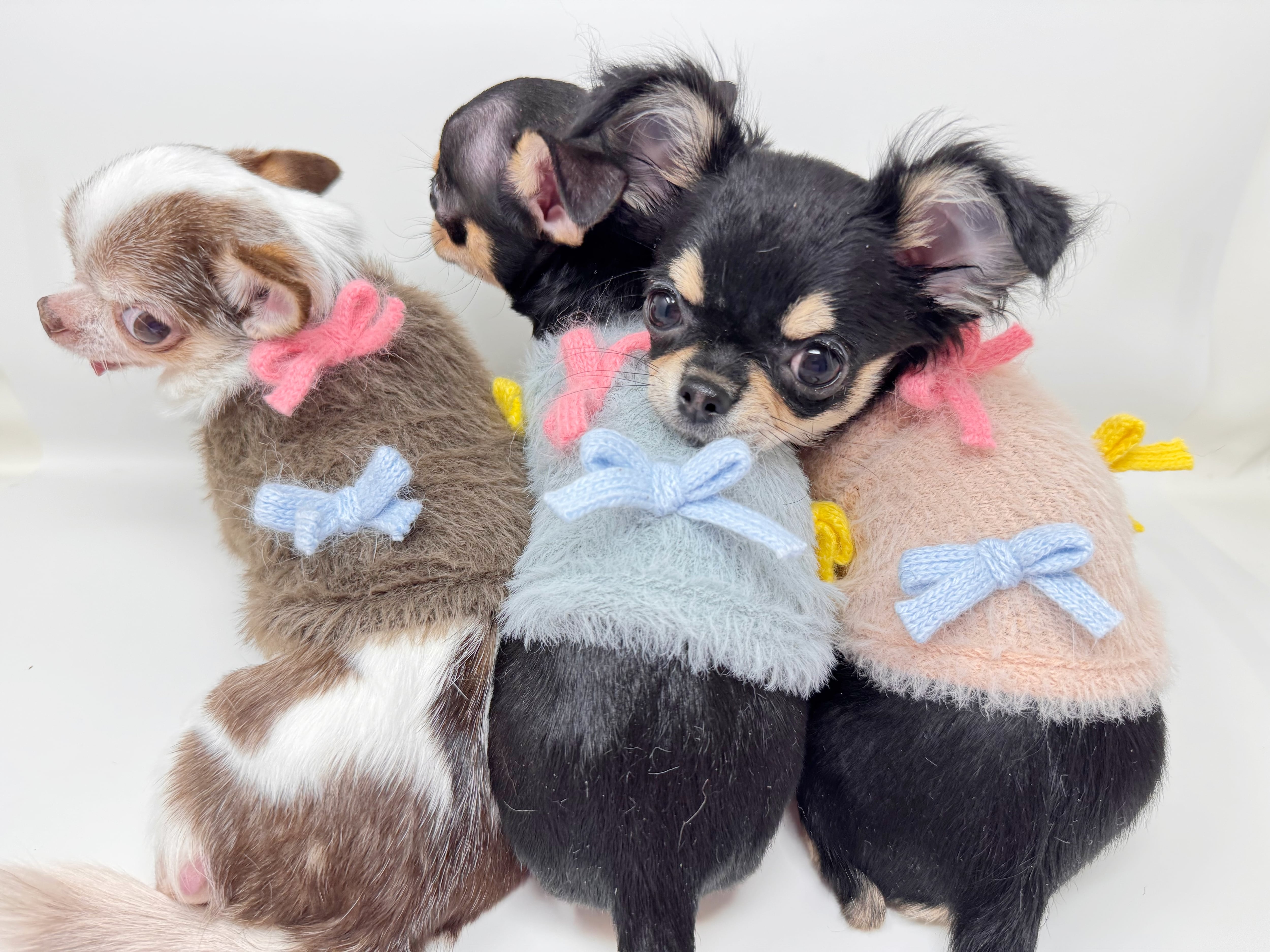 ■シャギーリボンカーディガン新登場です かわいらしさと機能性を兼ね備えたシャギーリボンカーディガンは、愛犬のお洒落を一層引き立てます。前開きのデザインで着せやすく、シャギー素材が温かさを保ちつつ、リボンが可愛いさをプラス!動きやすさにも配慮しているため、わんちゃんがストレスなく楽しめるアイテムです。 伸縮性があり、愛犬の体にフィットするので、日常のお散歩から特別な日のお出かけまで幅広いシーンで活躍します。